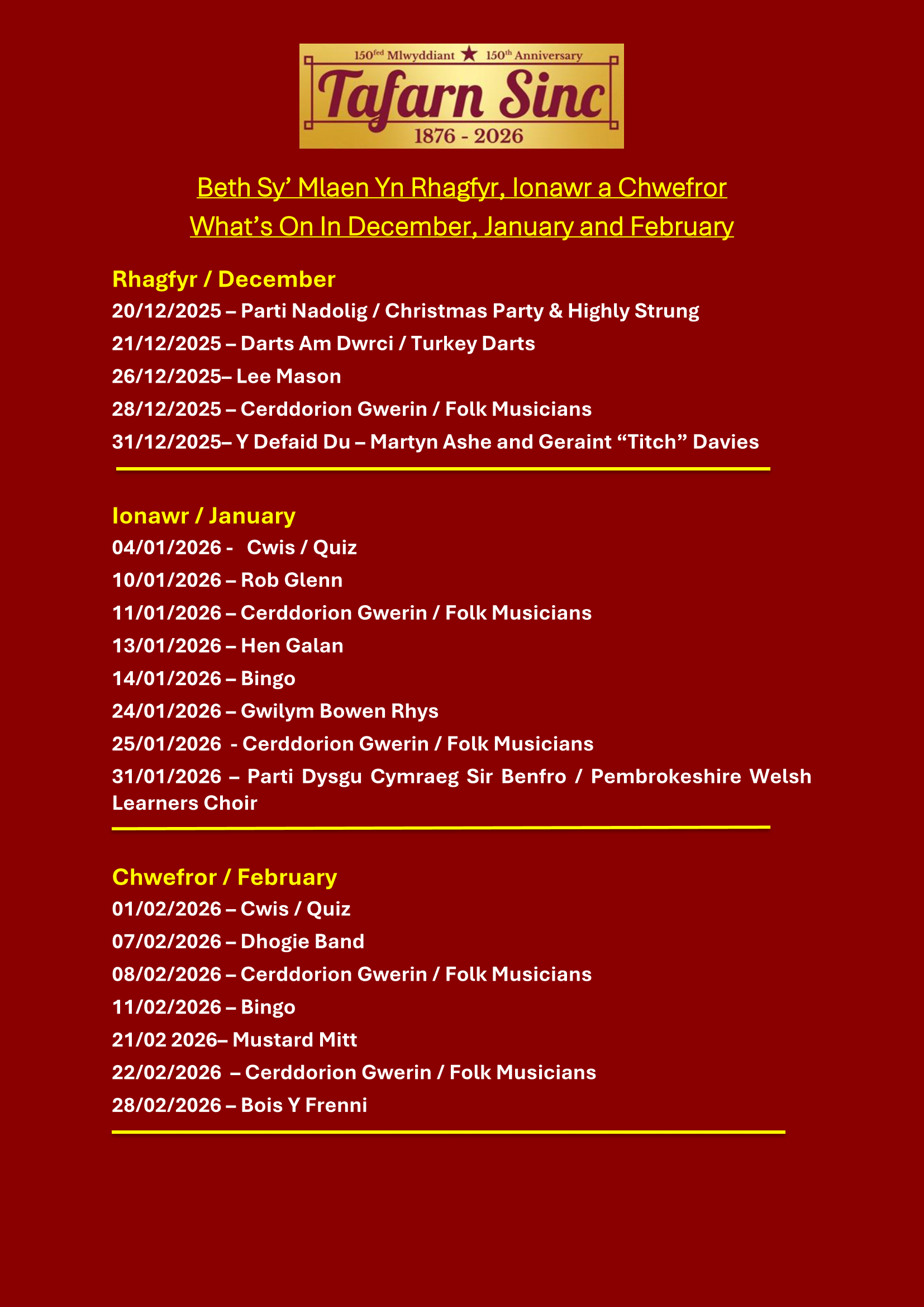 Tafarn Sinc has featured prominently in the social life of the area since 1876 when it was "The Precelly Hotel". As well as its unique ambience and history it is a repository of the Pembrokeshire ‘wês, wês’ dialect.